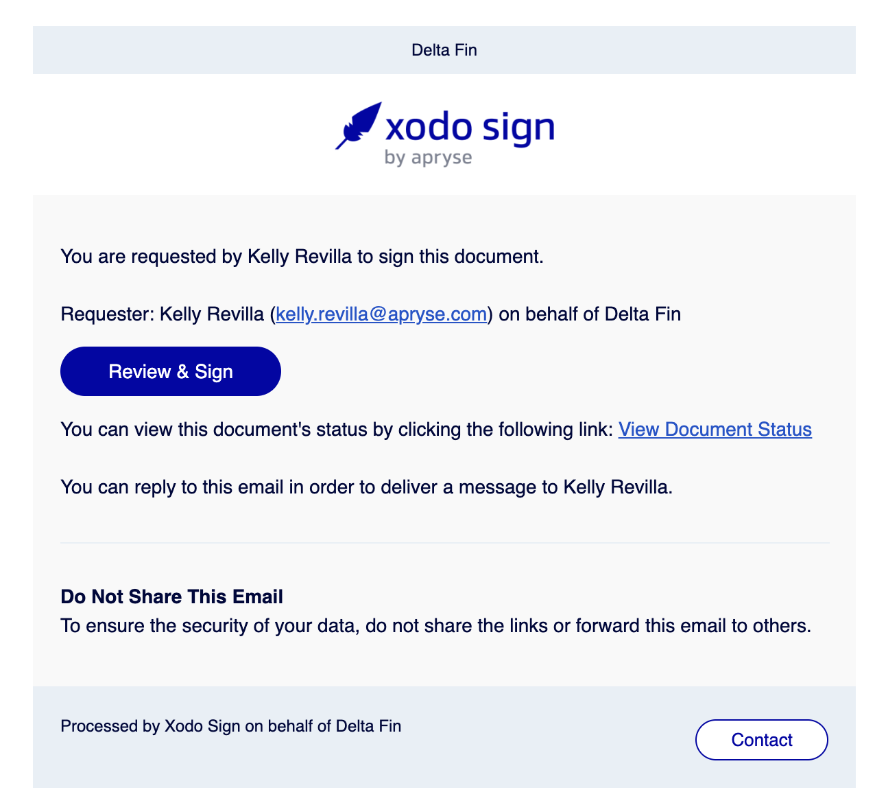 When someone sends you a document to sign through Xodo Sign, you will receive an email notification. The email will include the name of the requester, their organization, and a Review & Sign button.