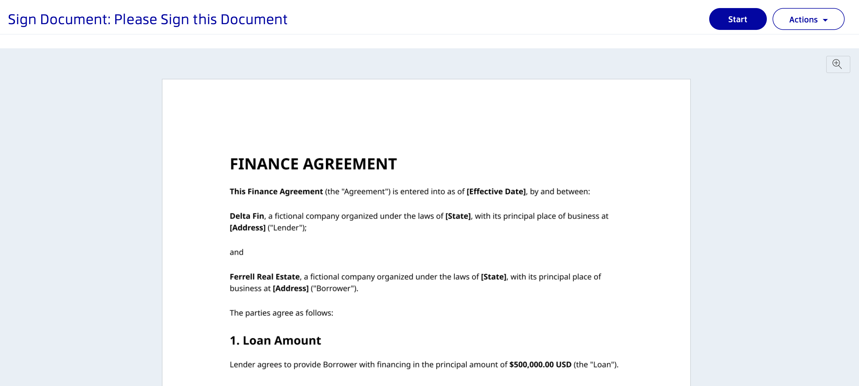 Click the Review & Sign button in the email. The document will open in your browser. Click the Start button in the top right corner to begin the signing process.