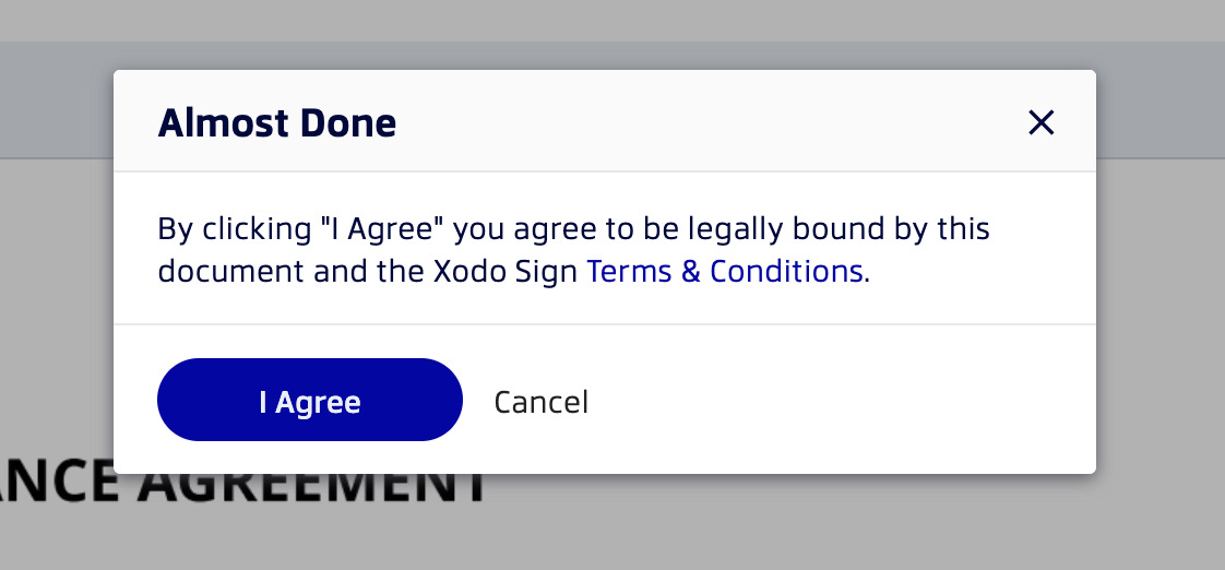 A After pop-up box will appear titled "Almost Done." By clicking I Agree, you confirm you agree to be legally bound by this document and the Xodo Sign Terms & Conditions. Click I Agree to complete the signing process.